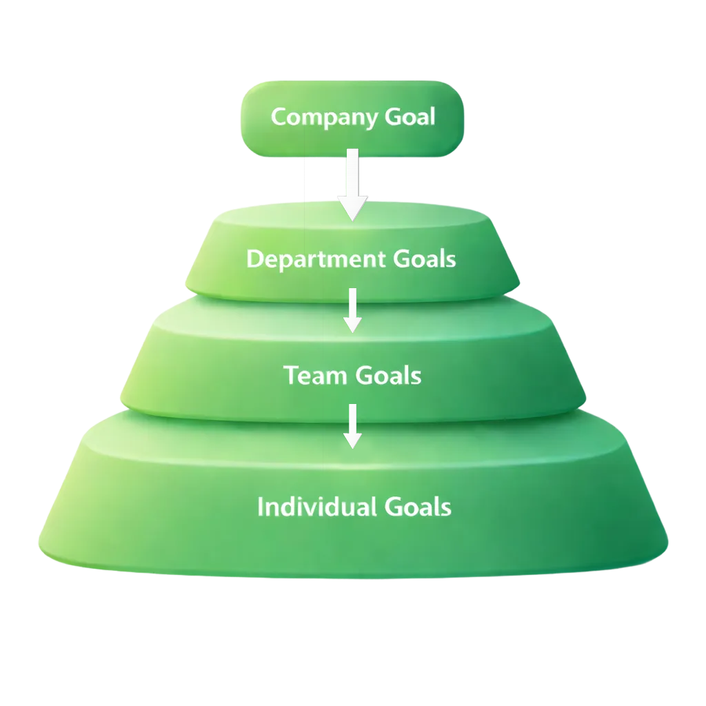 Leadership starts by defining clear company-level goals. Departments then translate those goals into priorities relevant to their function. Managers work with teams and individuals to define goals that support departmental objectives. Each layer builds on the one above it.