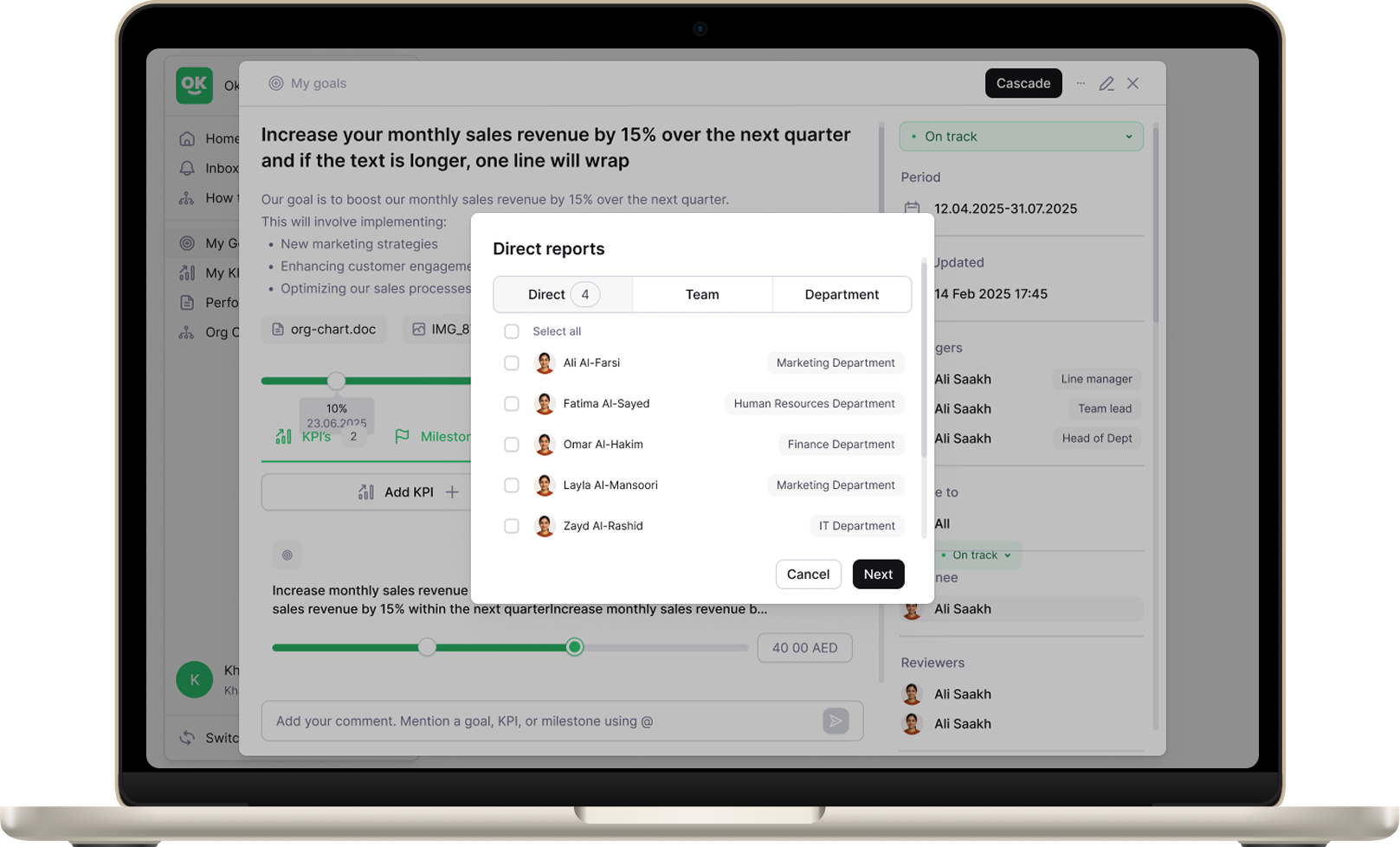 A manager starts by creating their own goal, for example, a departmental or team objective. From this goal, they can cascade it directly to their direct reports, creating linked goals for employees that clearly support the manager’s objective.