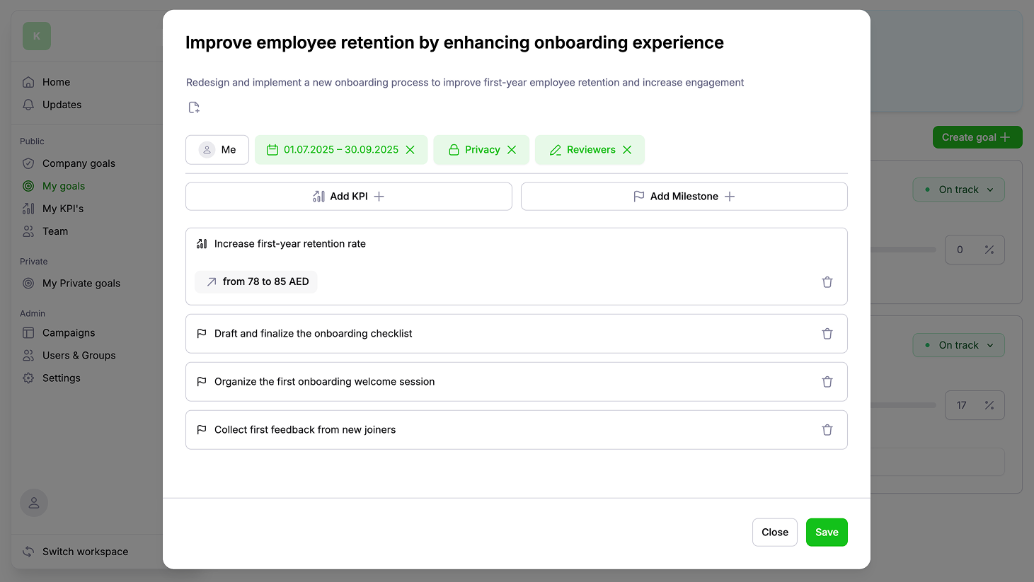 The percentage of individual or team goals achieved per quarter. It tells you whether people are focused, aligned, and performing. If scores are low — ask why. Are the goals too ambitious, or is something blocking execution?